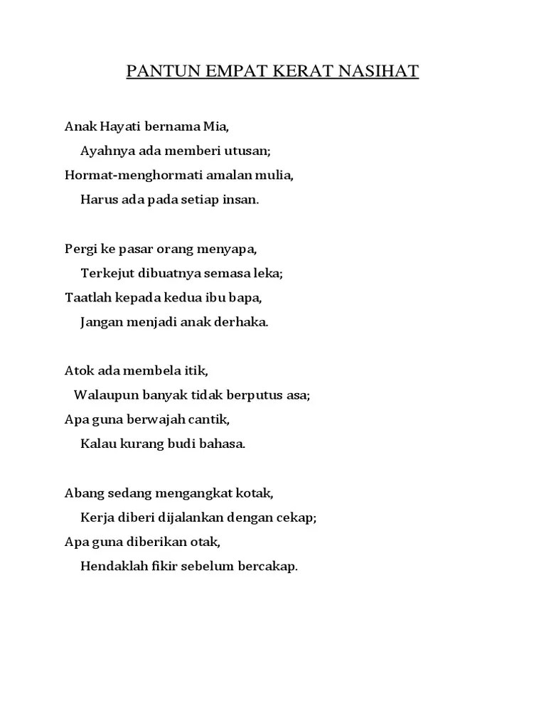 Pantun empat kerat yang selalu diperdengarkan di dalam kehidupan seharian kita. Budi pekerti berbalas 2 dan 4 bait untuk sekolah. Bagi kamu yang tak pandai menyusunnya, ada beberapa referensi . Nadia natasya binti surijansa d20172080465 nahu dan stilistika melayu lama pantun . Contoh pantun nasihat yang lain : Buat kerja cekap, guru puji selalu. Pantun 4 kerat nasihat (duduk di rumah).